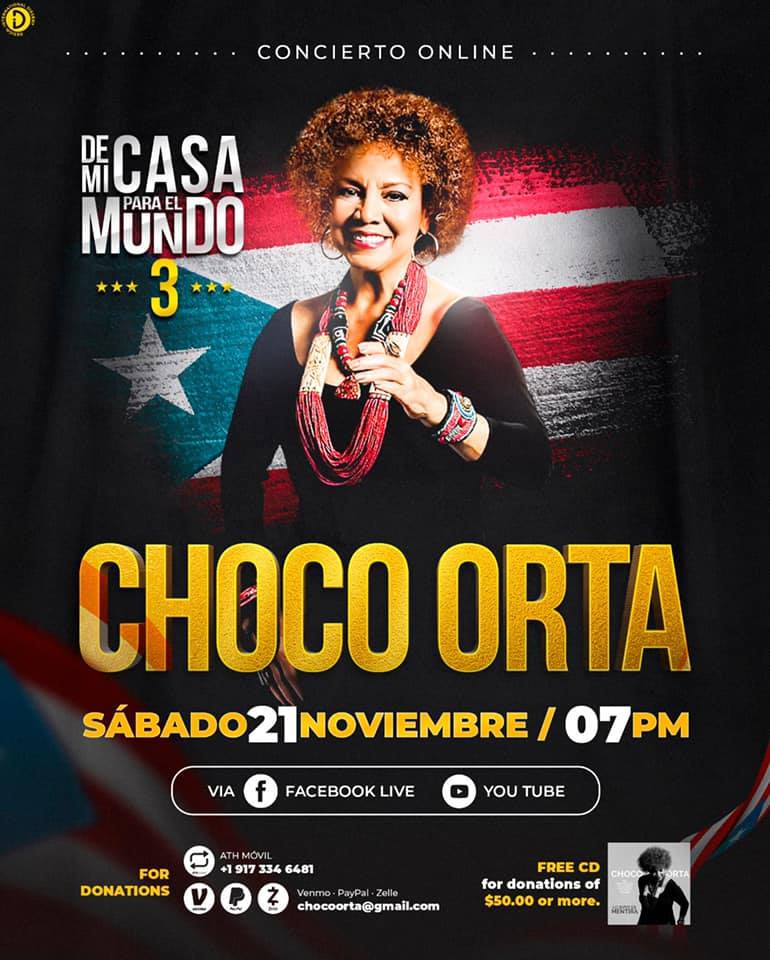 Hoy, sábado 21, la sonera boricua Choco Orta ofrecerá su concierto DE MI CASA PARA EL MUNDO 3.